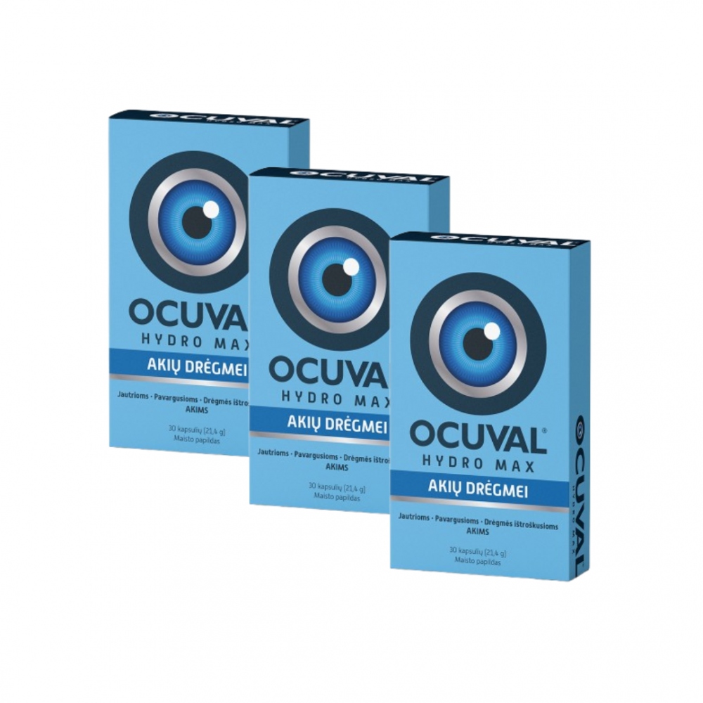 OCUVAL HYDRO MAX - drėkinančio poveikio geriamos kapsulės jautrioms, pavargusioms, daug dirbančioms ir drėgmės ištroškusioms akims.