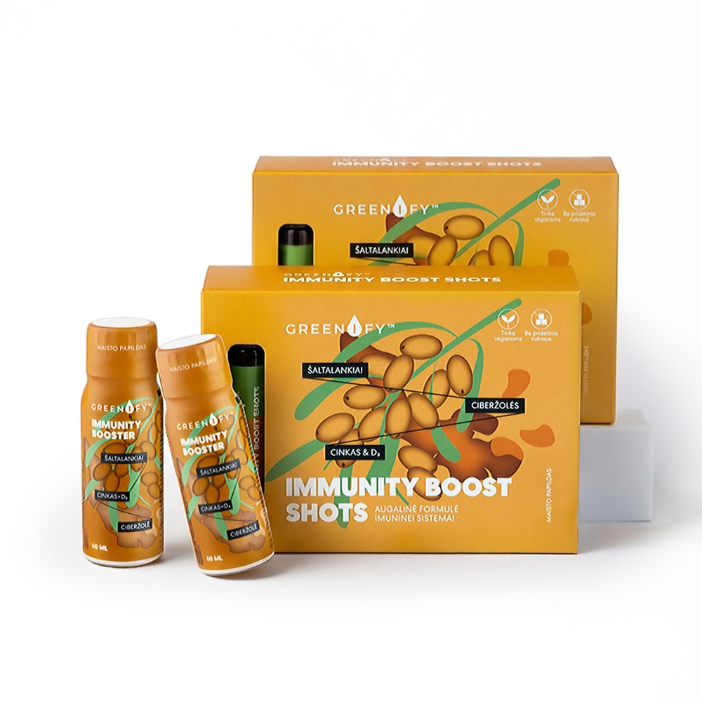 GREENIFY Immunity Boost Shots (2 vnt) – išgryninta, mėnesio laiko imuniteto programa aktyviai imuninei sistemai, organizmo apsauginėms funkcijoms ir gerai savijautai.